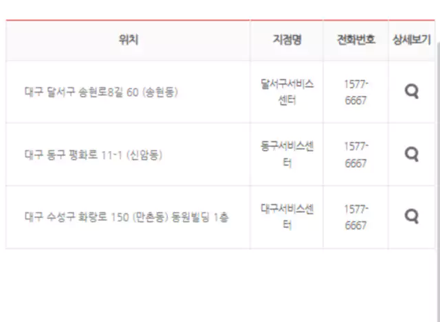 해당 서비스센터의 전화번호를 비롯하여 주소, 영업시간등을 확인할려면 오른쪽에 돋보기 버튼을 누르시면됩니다