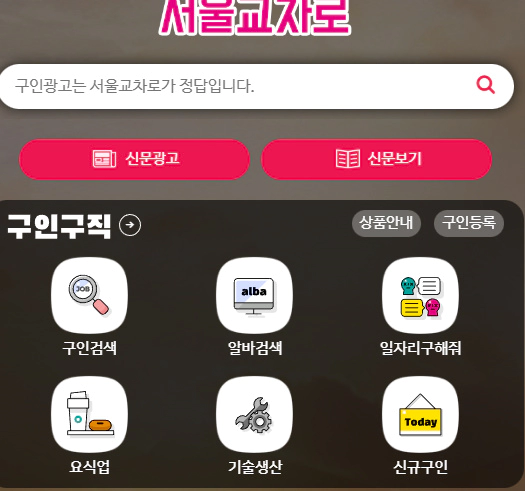 홈페이지에는 구인구직 관련, 구인검색, 알바검색, 일자리구해줘, 요식업, 기술생산, 신규구인등 구인구직을 위한 카테고리들이 많이 있습니다 원하는 카테고리를 살펴보시면됩니다