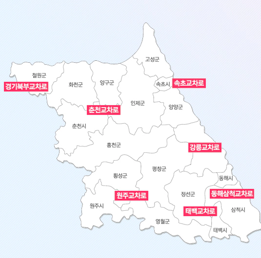 강원지역입니다, 경기북부, 춘천교차로, 속초교차로, 강릉교차로, 원주교차로,태백교차로, 동해삼척교차로가 운영중입니다