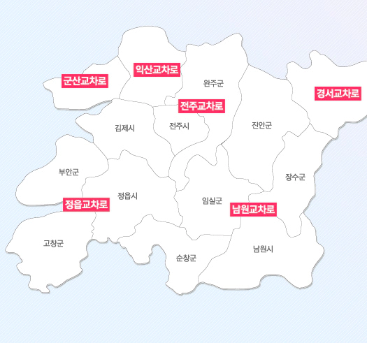 전북은 군산교차로, 익산교차로, 전주교차로구인구직, 경서교차로, 정읍교차로, 남원교차로가 운영중입니다
