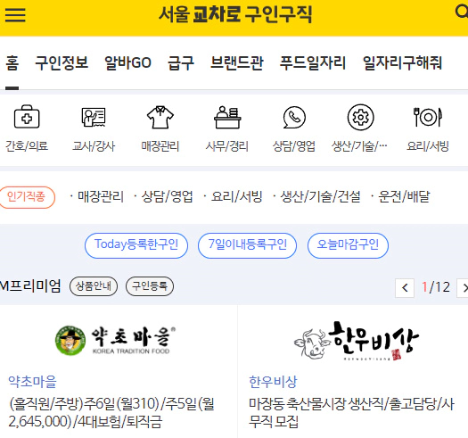 서울 교차로구인구직을 눌러 이동하니 위처럼, 간호의료, 교사강사, 매장관리, 사무 경리, 상담영업, 생산 기술, 요리서빙등 각 분야별로 나뉘어 일자리가 등록되어 있는것을 확인할수 있습니다