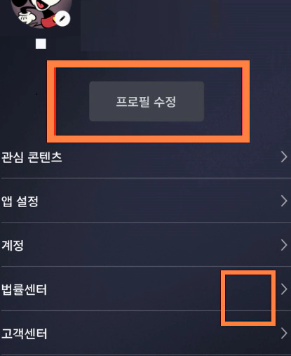 프로필 페이지로 이동하게되면 프로필수정 버튼과, 관심컨텐츠, 앱설정, 계정, 법률센터, 고객센터등의 메뉴가 있습니다