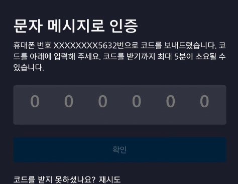 문자메시지로 코드를 받았다면 순서대로 숫자를 입력해주시고 확인버튼을 눌러주세요