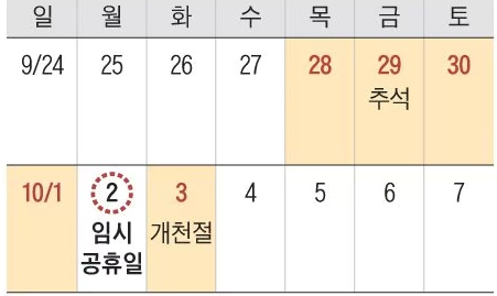 10월2일 임시공휴일이 확정이 되었으니 이번 추석계획을 잘 짜서 황금연휴를 가족과 좋은시간을 보낼수 있기를 바랍니다