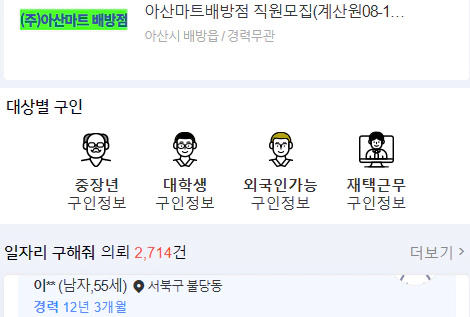 중장년부터 현재 방학으로 대학생 구인정보, 그리고 외국인 구인정보, 재택근무 구인정보를 확인이 가능합니다