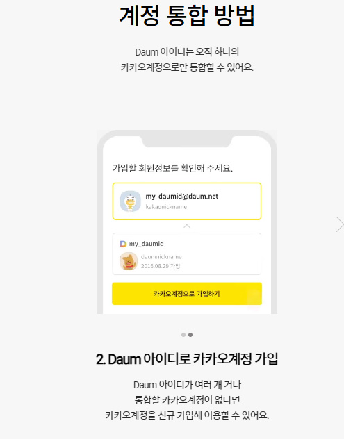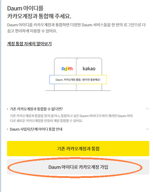 계정 통합 방법은 2가지가 있습니다 기존 카카오계정과 통합하는 방법과, daum 아이디로 카카오 계정 가입이 있습니다 한메일 로그인을 위해서는 daum 아이디로 카카오 계정 가입을 진행합니다