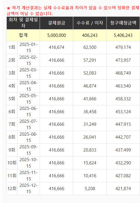 그럼 결과가 위처럼 나옵니다 납부 개월회차와 결제원금 이자 그리고 총 청구금액이 나옵니다 이렇게 할부이자를 계산하고 본인의 월급등을 생각하시고 필요한 물품을 구입하셔야 합니다