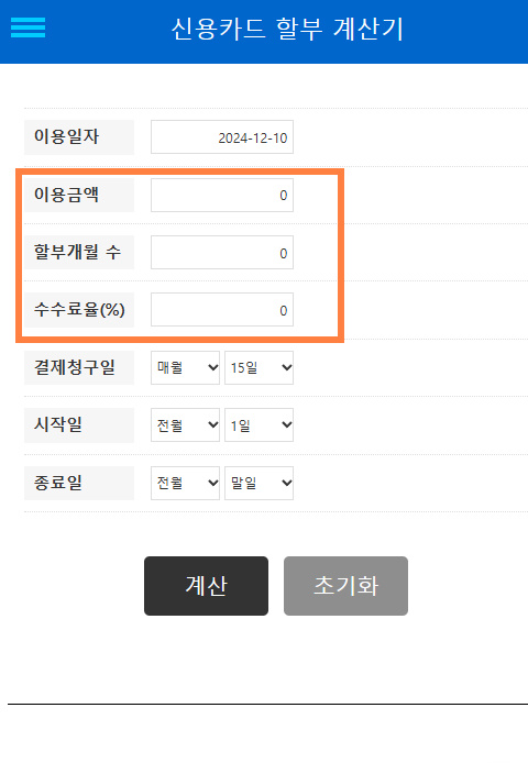 여기서 본인이 현재 계산을 하기위한 이용금액, 할부개월 수, 수수료율을 정확히 넣으셔야 합니다 사실 결제청구일, 시작일, 종류일을 정확히 넣으면 좋겠지만 안넣어도 할부 이자 계산하는데는 그렇게 지장이 없습니다