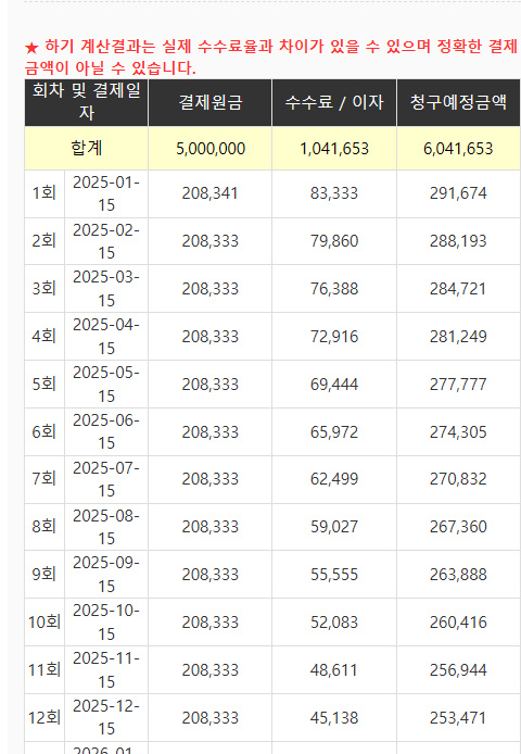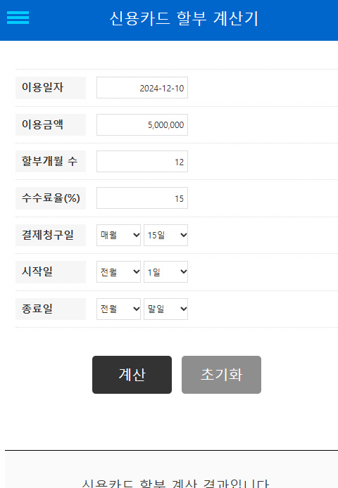예시로, 이용금액은 5백 , 할부개월 수는 12개월, 수수율은 15%를 잡고 계산을 해보았습니다 이것은 예시이니 본인의 물품가액가, 할부개월, 수수료율을 넣으시고 신용카드 할부이자 계산기를 이용하시면됩니다