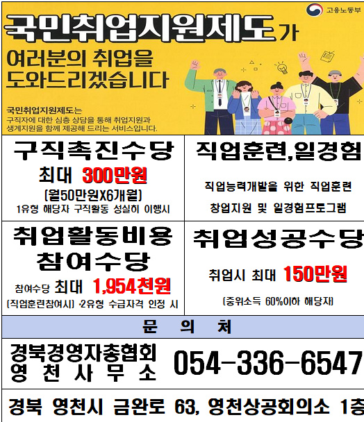 영천시 취업지원센터는 국민취업지원제도로 여러분의 취업을 돕기위해 힘쓰고 있습니다 구직촉진수당을 비롯하여, 직업훈련, 취업활동비용 참여수당, 취업성공수당을 지원하고 있습니다