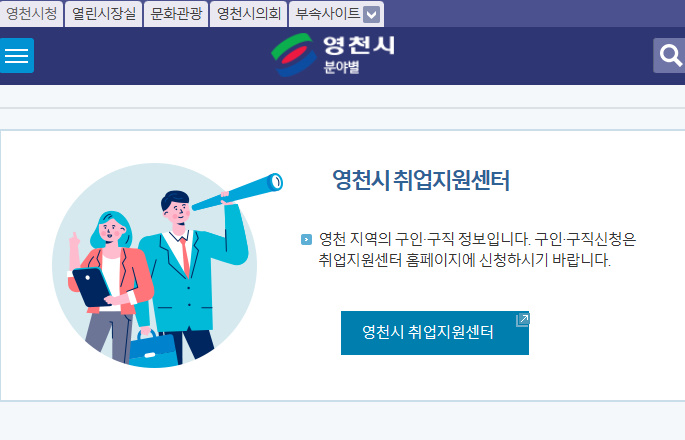 영천시청은 영천시민분들을 위하여서 영천시청 홈페이지를 통해 구인구직 게시판을 운영하였습니다 하지만 일자리를 찾는분들이 많아져서 기존에 구인구직 게시판을 없애고 영천시 취업지원센터를 오픈하여 운영중입니다