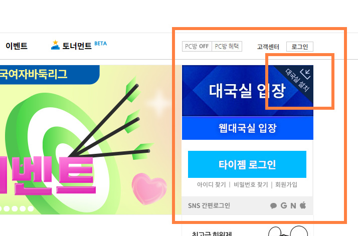 공식홈페이지를 이동하며, 오른쪽에 대국실 입장 버튼이 있습니다 대국실입장 혹은 대국실 설치 버튼을 누르면됩니다 설치가 되어있다면 바로 대국실 입장이되고, 그렇지않다면, 타이젬 다운로드 진행 후 설치가 진행이됩니다