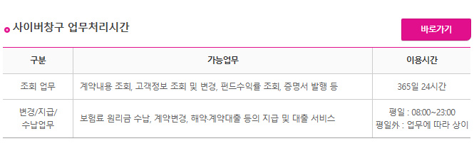 사이버 창구는 356일 24시간 가능합니다 계약조회, 고객정보조회, 펀드수익률 조회 등이 가능합니다