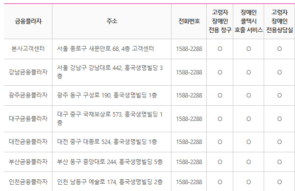 흥국생명은 전국에 7개의 금융플라자 고객센터를 운영중입니다 금융플라자를 통해서, 보험가입 계약상담, 보험료 납입, 부활, 계약대출 원금상환, 사고보험금 접수 등의 업무를 하실수가 있습니다