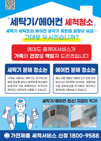 세탁기와 에어컨은 주기적으로 청소 해야 하는거 아시죠? 특히 빨래에 냄새가 난다면 세탁기 청소를 해야 합니다 대우에서는 에이드 홈케어버시스가 도입되어 있습니다 세탁기 분해 청소가 필요하신분은 1800-9588로 문의 하시기 바랍니다